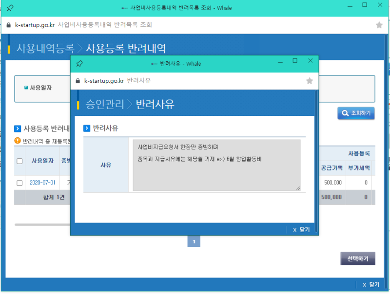 1. 반려 통보 화면 캡처 후 문구 정확히 확인
