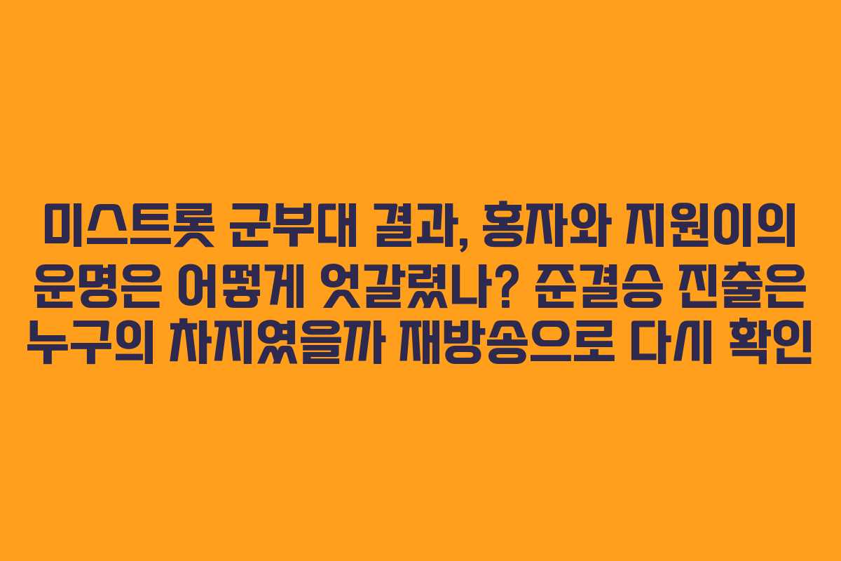 아래를 읽어보시면 미스트롯 군부대 결과의 핵심 흐름과 홍자와 지원이의 운명, 준결승 진출자 확정 여부, 그리고 재방송·다시보기 일정까지 한 눈에 정리됩니다. 현장의 긴장감과 심사위원의 포인트를 체감하며, 다음 방송의 가능성까지 엿볼 수 있게 구성했습니다.