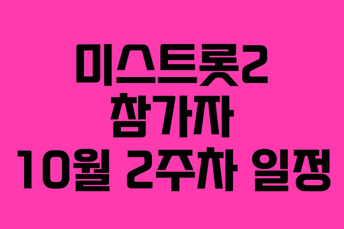 미스트롯2 참가자들의 10월 2주차 일정이 공개되었습니다. 이 일정을 통해 각 참가자들의 공연 및 방송 출연 정보가 포함되어 있어 팬들에게 많은 관심을 받고 있습니다.