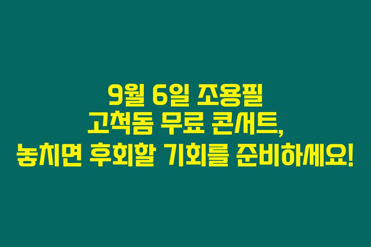 조용필 고척돔 무료 콘서트는 정말 놓치지 말아야 할 이벤트입니다. 많은 분들이 이 기회를 통해 가왕의 진면목을 느껴보시길 바랄게요! 소중한 경험이 될 테니, 잘 준비해서 멋진 순간을 만끽하세요!