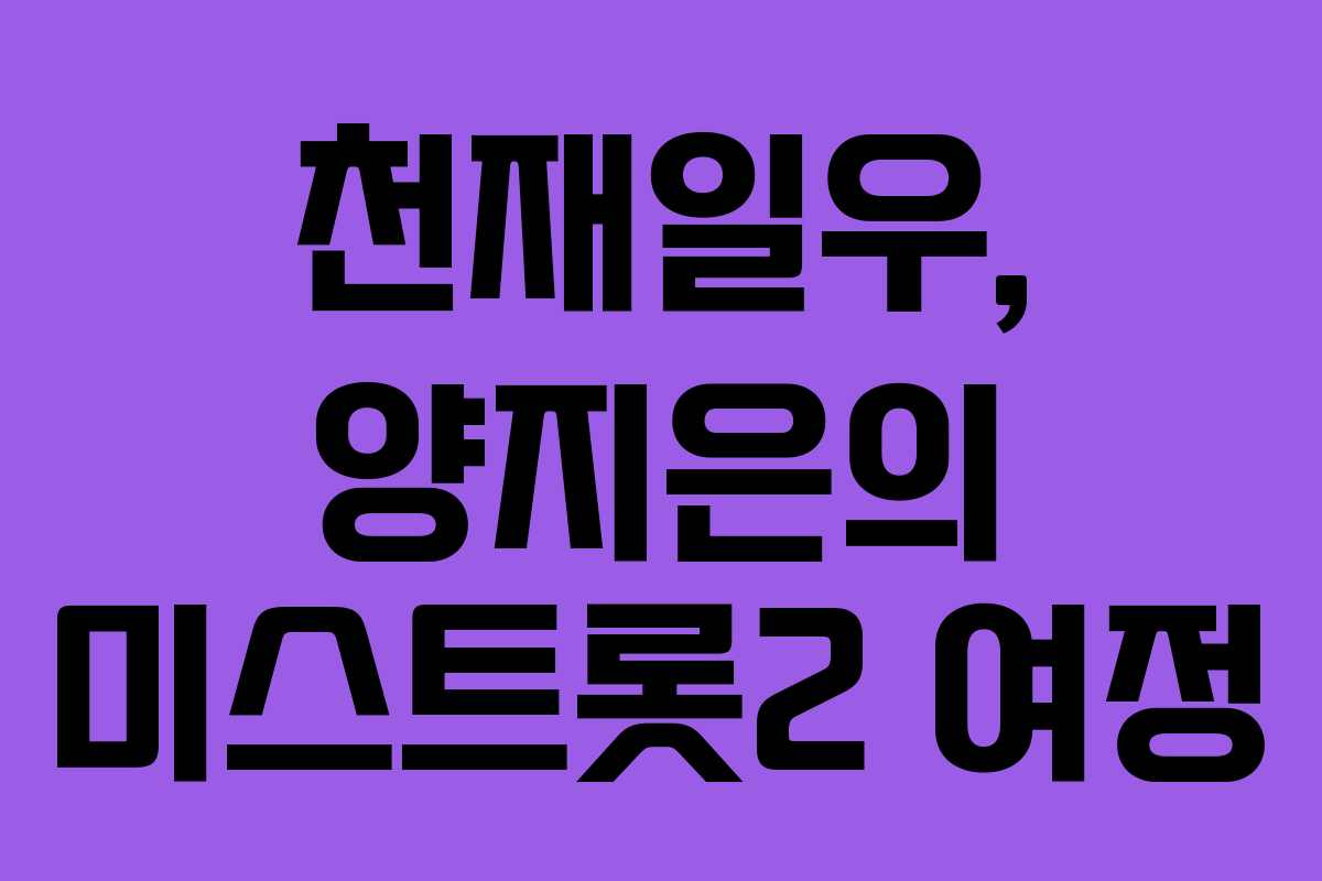 양지은 양은 미스트롯2에서 ‘천재일우’의 기회를 잡게 됩니다. 그녀는 판소리를 전공한 국악인으로, 아버지를 위해 노래를 다시 시작하게 되었습니다. 양지은 양의 미소와 긍정적인 에너지는 많은 사람들에게 희망을 주었습니다.