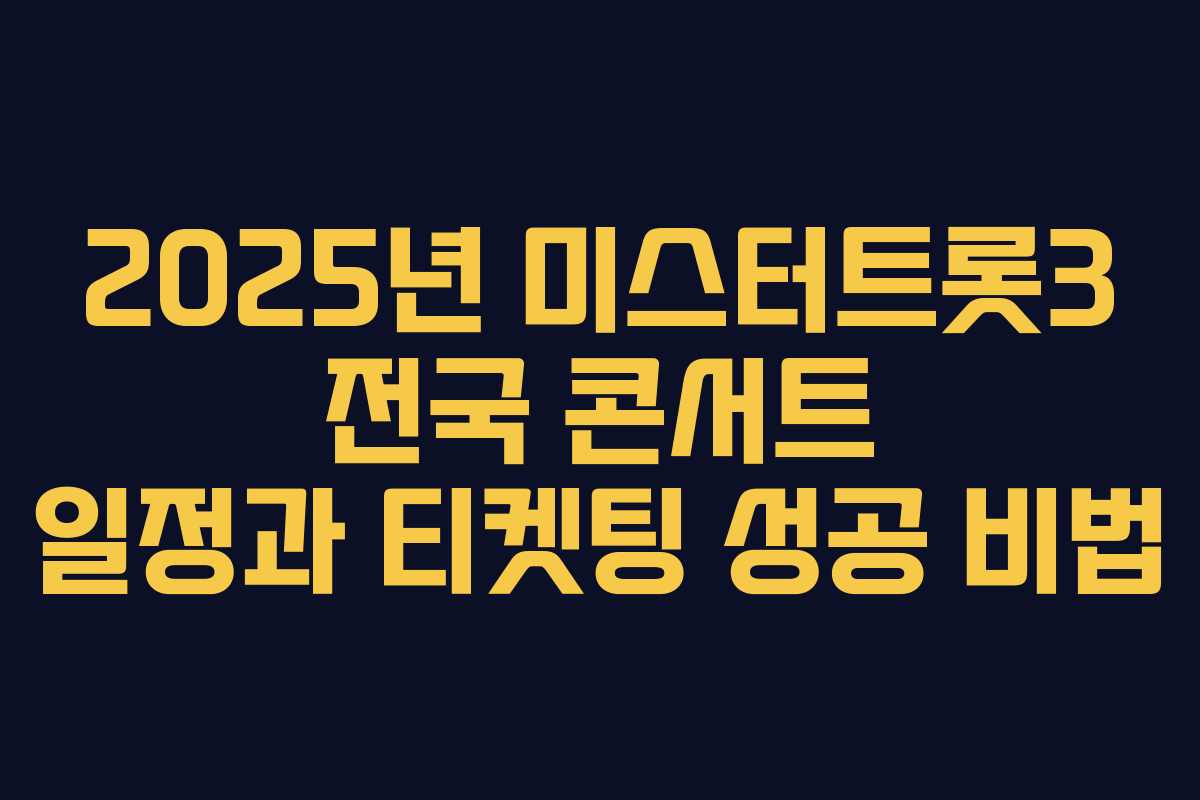 2025년 미스터트롯3 콘서트가 2024년 12월 19일부터 방송을 시작하며 많은 관심을 끌고 있습니다. 이와 함께 예정된 전국 투어 콘서트 일정과 티켓 예매 방법, 성공 팁을 정리해보았습니다.